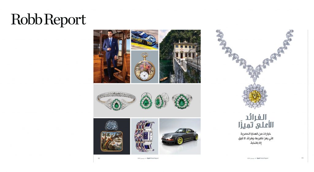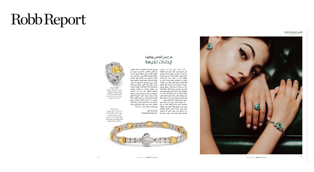 Robb Report features Nadine Jewellery in its December 2019 printed publication’s ultimate gift guide, highlighting Farah, the engagement collection, with a spotlight on the Lily and La Broderie collections.